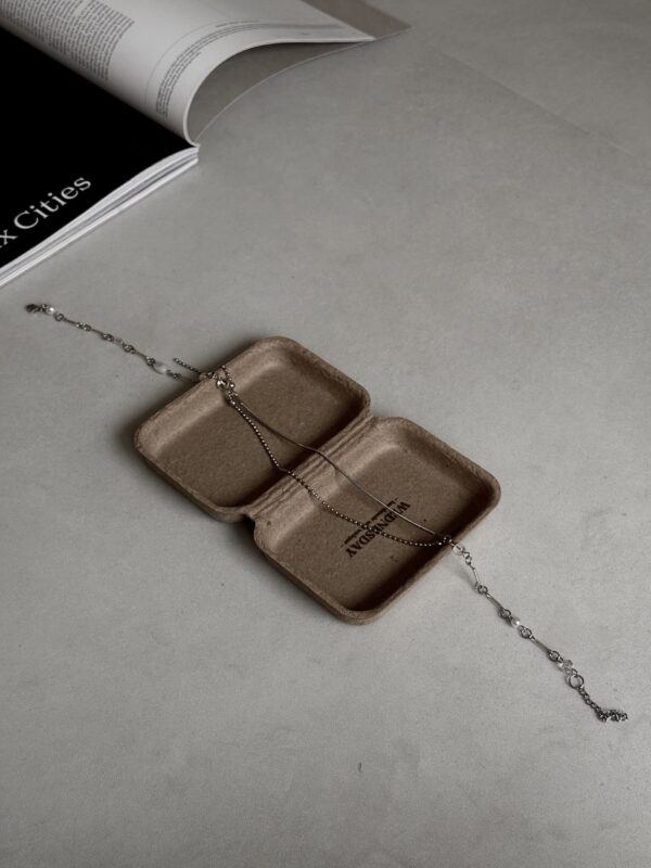 項鍊以兩種銀鏈錯落組合,一側是光滑的蛇鏈細膩順滑 充分展現出項鍊的線條感